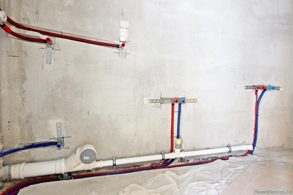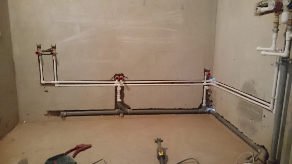 Отсутствие труб. Это обычно характерно для квартир в новостройках. Тогда в месте, где планируется установить смеситель, необходимо провести трубы. Для этого делается штроба от входа холодного и горячего водопроводов до места установки смесителя. В штробу вкладываются пластиковые трубы, отрезки которых спаиваются с помощью муфт. СНиП утверждает, что трубы должны располагаться над верхним краем ванны (на 200 мм выше него). Расстояние между выходными точками должно быть в пределах 150 мм. Перед тем как закрепить фитинги на трубах, следует проверить горизонталь ватерпасом. Это поможет ровно установить смеситель.