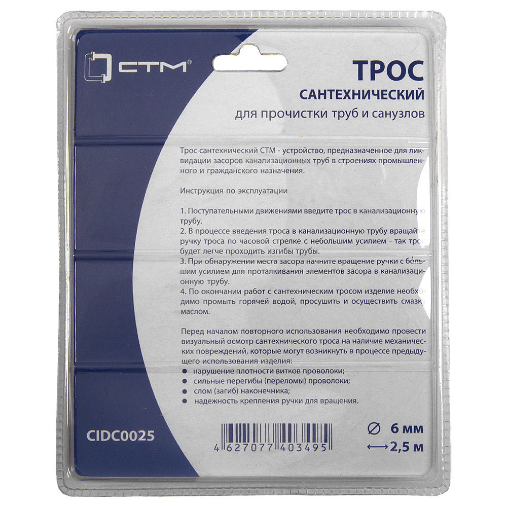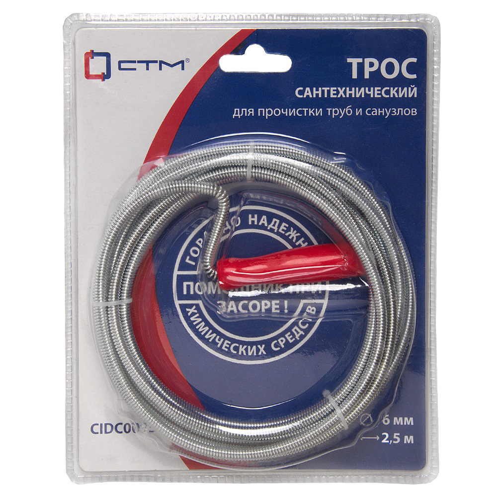 Трос сантехнический оцинкованный с ручкой 1,4 мм х 6,0 мм х 2,5 СТМ в фирменной упаковке предназначен для учного устранения засоров канализационных труб в строениях промышленного и гражданского назначения, где не справляются химические средства и вантузы.