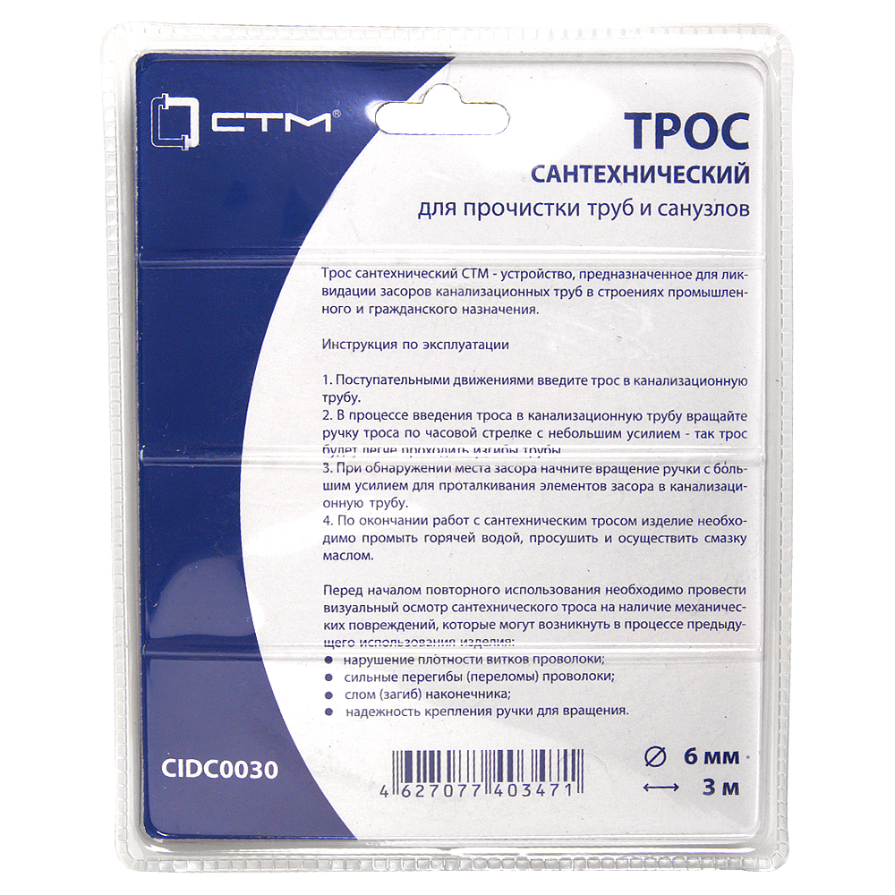 Трос сантехнический оцинкованный с ручкой 1,4 мм х 6,0 мм х 3,0 м СТМ в фирменной упаковке предназначен для учного устранения засоров канализационных труб в строениях промышленного и гражданского назначения, где не справляются химические средства и вантузы.