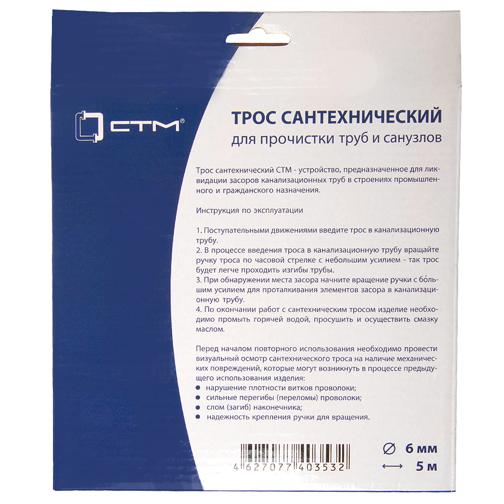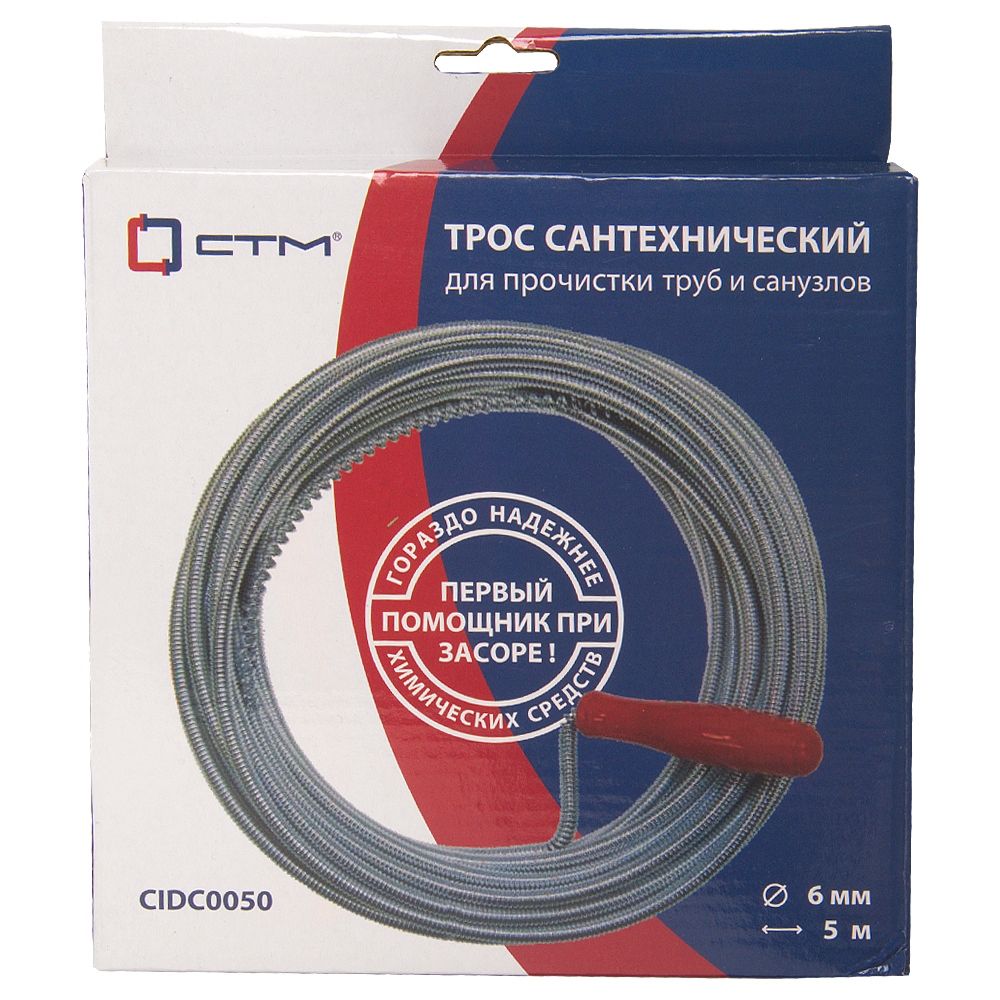 Трос сантехнический оцинкованный с ручкой 1,4 мм х 6,0 мм х 5,0 м СТМ в фирменной упаковке предназначен для учного устранения засоров канализационных труб в строениях промышленного и гражданского назначения, где не справляются химические средства и вантузы.