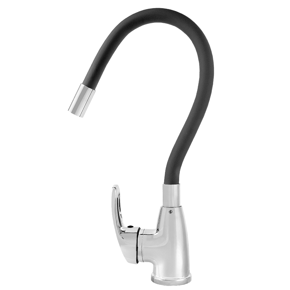 Однозахватный смеситель FLOE FK234-GN для кухни с боковым расположением ручки и гибким черным изливом.