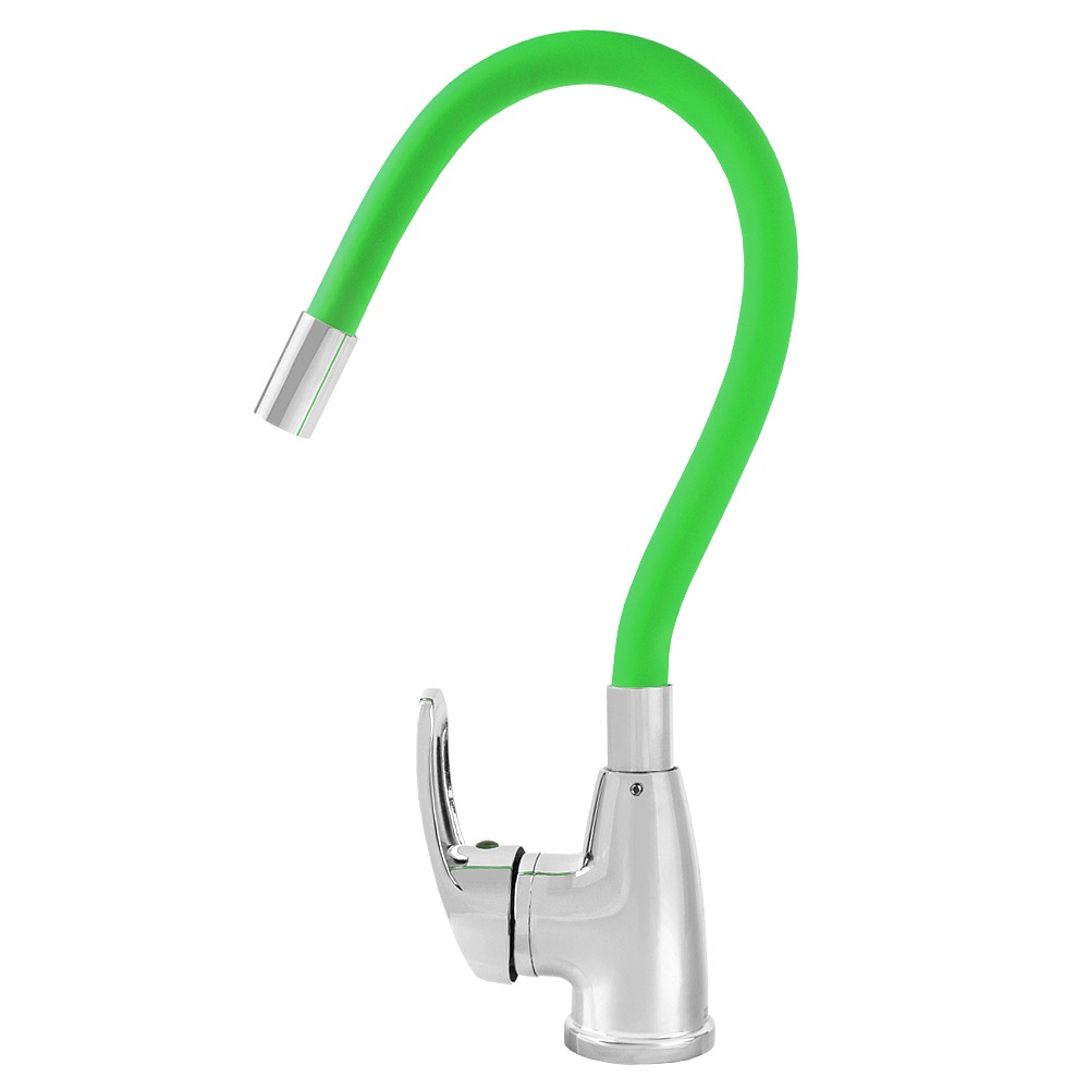 Однозахватный смеситель FLOE FK234-GG для кухни с боковым расположением ручки и гибким салатовым изливом.